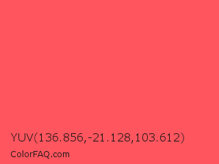 YUV 136.856,-21.128,103.612 Color is a light red color and the nearest color is Carnation #f95a61. Hex code #ff555e and RGB value is rgb(255,85,94). In RGB color space, this color is composed of 100% red, 33% green, 37% blue, In CMYK color space, this color is composed of 0% cyan, 67% magenta, 63% yellow , 0% black , In HSL color space, this color has a hue angle of 357° , 100% saturation and 67% lightness.