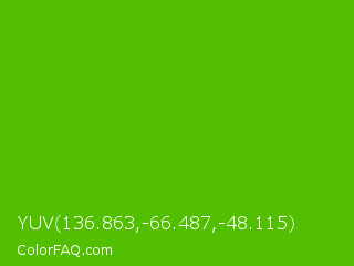 YUV 136.863,-66.487,-48.115 Color is a normal green color and the nearest color is Kelly Green #4cbb17. Hex code #52bf02 and RGB value is rgb(82,191,2). In RGB color space, this color is composed of 32% red, 75% green, 1% blue, In CMYK color space, this color is composed of 57% cyan, 0% magenta, 99% yellow , 25% black , In HSL color space, this color has a hue angle of 95° , 98% saturation and 38% lightness.