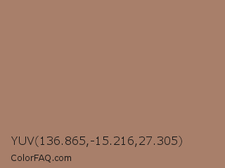YUV 136.865,-15.216,27.305 Color is a normal orange color and the nearest color is Beaver #9f8170. Hex code #a87f6a and RGB value is rgb(168,127,106). In RGB color space, this color is composed of 66% red, 50% green, 42% blue, In CMYK color space, this color is composed of 0% cyan, 24% magenta, 37% yellow , 34% black , In HSL color space, this color has a hue angle of 20° , 26% saturation and 54% lightness.