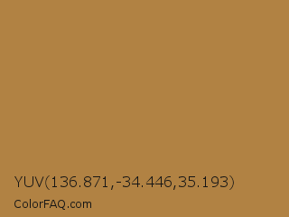 YUV 136.871,-34.446,35.193 Color is a normal orange color and the nearest color is Driftwood #af8751. Hex code #b18243 and RGB value is rgb(177,130,67). In RGB color space, this color is composed of 69% red, 51% green, 26% blue, In CMYK color space, this color is composed of 0% cyan, 27% magenta, 62% yellow , 31% black , In HSL color space, this color has a hue angle of 34° , 45% saturation and 48% lightness.