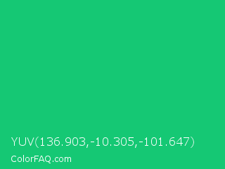 YUV 136.903,-10.305,-101.647 Color is a normal green color and the nearest color is Mountain Meadow Crayola #1ab385. Hex code #15c874 and RGB value is rgb(21,200,116). In RGB color space, this color is composed of 8% red, 78% green, 45% blue, In CMYK color space, this color is composed of 90% cyan, 0% magenta, 42% yellow , 22% black , In HSL color space, this color has a hue angle of 152° , 81% saturation and 43% lightness.