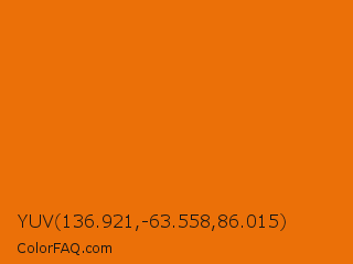 YUV 136.921,-63.558,86.015 Color is a normal orange color and the nearest color is Christine #e7730a. Hex code #eb7008 and RGB value is rgb(235,112,8). In RGB color space, this color is composed of 92% red, 44% green, 3% blue, In CMYK color space, this color is composed of 0% cyan, 52% magenta, 97% yellow , 8% black , In HSL color space, this color has a hue angle of 27° , 93% saturation and 48% lightness.