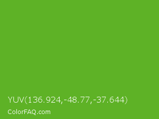 YUV 136.924,-48.77,-37.644 Color is a normal green color and the nearest color is Green RYB #66b032. Hex code #5eb226 and RGB value is rgb(94,178,38). In RGB color space, this color is composed of 37% red, 70% green, 15% blue, In CMYK color space, this color is composed of 47% cyan, 0% magenta, 79% yellow , 30% black , In HSL color space, this color has a hue angle of 96° , 65% saturation and 42% lightness.