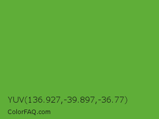 YUV 136.927,-39.897,-36.77 Color is a normal green color and the nearest color is Green RYB #66b032. Hex code #5fae38 and RGB value is rgb(95,174,56). In RGB color space, this color is composed of 37% red, 68% green, 22% blue, In CMYK color space, this color is composed of 45% cyan, 0% magenta, 68% yellow , 32% black , In HSL color space, this color has a hue angle of 100° , 51% saturation and 45% lightness.
