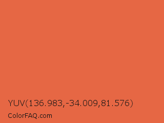 YUV 136.983,-34.009,81.576 Color is a normal red color and the nearest color is Red Damask #da6a41. Hex code #e66744 and RGB value is rgb(230,103,68). In RGB color space, this color is composed of 90% red, 40% green, 27% blue, In CMYK color space, this color is composed of 0% cyan, 55% magenta, 70% yellow , 10% black , In HSL color space, this color has a hue angle of 13° , 76% saturation and 58% lightness.
