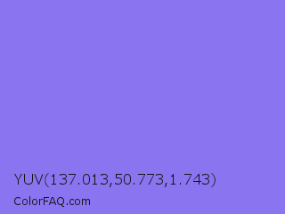 YUV 137.013,50.773,1.743 Color is a light indigo color and the nearest color is Medium Slate Blue #7b68ee. Hex code #8b74f0 and RGB value is rgb(139,116,240). In RGB color space, this color is composed of 55% red, 45% green, 94% blue, In CMYK color space, this color is composed of 42% cyan, 52% magenta, 0% yellow , 6% black , In HSL color space, this color has a hue angle of 251° , 81% saturation and 70% lightness.