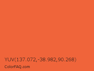 YUV 137.072,-38.982,90.268 Color is a normal red color and the nearest color is Orange Soda #fa5b3d. Hex code #f0643a and RGB value is rgb(240,100,58). In RGB color space, this color is composed of 94% red, 39% green, 23% blue, In CMYK color space, this color is composed of 0% cyan, 58% magenta, 76% yellow , 6% black , In HSL color space, this color has a hue angle of 14° , 86% saturation and 58% lightness.