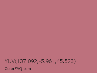 YUV 137.092,-5.961,45.523 Color is a normal red color and the nearest color is Rose Gold #b76e79. Hex code #bd717d and RGB value is rgb(189,113,125). In RGB color space, this color is composed of 74% red, 44% green, 49% blue, In CMYK color space, this color is composed of 0% cyan, 40% magenta, 34% yellow , 26% black , In HSL color space, this color has a hue angle of 351° , 37% saturation and 59% lightness.
