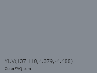 YUV 137.118,4.379,-4.488 Color is a normal blue color and the nearest color is Roman Silver #838996. Hex code #848a92 and RGB value is rgb(132,138,146). In RGB color space, this color is composed of 52% red, 54% green, 57% blue, In CMYK color space, this color is composed of 10% cyan, 5% magenta, 0% yellow , 43% black , In HSL color space, this color has a hue angle of 214° , 6% saturation and 55% lightness.