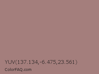 YUV 137.134,-6.475,23.561 Color is a normal red color and the nearest color is Pharlap #a3807b. Hex code #a47e7c and RGB value is rgb(164,126,124). In RGB color space, this color is composed of 64% red, 49% green, 49% blue, In CMYK color space, this color is composed of 0% cyan, 23% magenta, 24% yellow , 36% black , In HSL color space, this color has a hue angle of 3° , 18% saturation and 56% lightness.