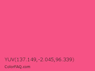 YUV 137.149,-2.045,96.339 Color is a light rose color and the nearest color is French Rose #f64a8a. Hex code #f75285 and RGB value is rgb(247,82,133). In RGB color space, this color is composed of 97% red, 32% green, 52% blue, In CMYK color space, this color is composed of 0% cyan, 67% magenta, 46% yellow , 3% black , In HSL color space, this color has a hue angle of 341° , 91% saturation and 65% lightness.