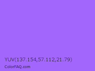 YUV 137.154,57.112,21.79 Color is a light violet color and the nearest color is Navy Purple #9457eb. Hex code #a266fd and RGB value is rgb(162,102,253). In RGB color space, this color is composed of 64% red, 40% green, 99% blue, In CMYK color space, this color is composed of 36% cyan, 60% magenta, 0% yellow , 1% black , In HSL color space, this color has a hue angle of 264° , 97% saturation and 70% lightness.