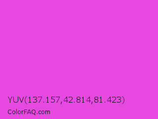 YUV 137.157,42.814,81.423 Color is a normal magenta color and the nearest color is Purple Pizzazz #fe4eda. Hex code #e649e0 and RGB value is rgb(230,73,224). In RGB color space, this color is composed of 90% red, 29% green, 88% blue, In CMYK color space, this color is composed of 0% cyan, 68% magenta, 3% yellow , 10% black , In HSL color space, this color has a hue angle of 302° , 76% saturation and 59% lightness.