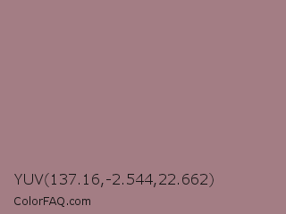 YUV 137.16,-2.544,22.662 Color is a normal red color and the nearest color is Pharlap #a3807b. Hex code #a37d84 and RGB value is rgb(163,125,132). In RGB color space, this color is composed of 64% red, 49% green, 52% blue, In CMYK color space, this color is composed of 0% cyan, 23% magenta, 19% yellow , 36% black , In HSL color space, this color has a hue angle of 349° , 17% saturation and 56% lightness.