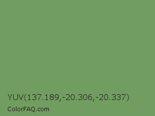 YUV 137.189,-20.306,-20.337 Color is a normal green color and the nearest color is Asparagus Green #7ba05b. Hex code #729d60 and RGB value is rgb(114,157,96). In RGB color space, this color is composed of 45% red, 62% green, 38% blue, In CMYK color space, this color is composed of 27% cyan, 0% magenta, 39% yellow , 38% black , In HSL color space, this color has a hue angle of 102° , 24% saturation and 50% lightness.
