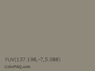 YUV 137.198,-7,5.088 Color is a normal orange color and the nearest color is Natural Gray #8b8680. Hex code #8f897b and RGB value is rgb(143,137,123). In RGB color space, this color is composed of 56% red, 54% green, 48% blue, In CMYK color space, this color is composed of 0% cyan, 4% magenta, 14% yellow , 44% black , In HSL color space, this color has a hue angle of 42° , 8% saturation and 52% lightness.