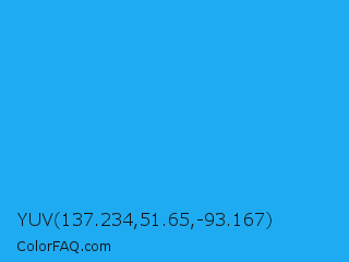 YUV 137.234,51.65,-93.167 Color is a normal blue color and the nearest color is Button Blue #24a0ed. Hex code #1fabf2 and RGB value is rgb(31,171,242). In RGB color space, this color is composed of 12% red, 67% green, 95% blue, In CMYK color space, this color is composed of 87% cyan, 29% magenta, 0% yellow , 5% black , In HSL color space, this color has a hue angle of 200° , 89% saturation and 54% lightness.