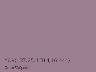 YUV 137.25,4.314,16.444 Color is a normal magenta color and the nearest color is Mountbatten Pink #997a8d. Hex code #9c7e92 and RGB value is rgb(156,126,146). In RGB color space, this color is composed of 61% red, 49% green, 57% blue, In CMYK color space, this color is composed of 0% cyan, 19% magenta, 6% yellow , 39% black , In HSL color space, this color has a hue angle of 320° , 13% saturation and 55% lightness.