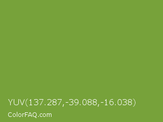 YUV 137.287,-39.088,-16.038 Color is a normal green color and the nearest color is Palm Leaf #6f9940. Hex code #77a23a and RGB value is rgb(119,162,58). In RGB color space, this color is composed of 47% red, 64% green, 23% blue, In CMYK color space, this color is composed of 27% cyan, 0% magenta, 64% yellow , 36% black , In HSL color space, this color has a hue angle of 85° , 47% saturation and 43% lightness.