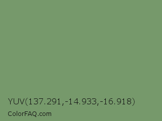 YUV 137.291,-14.933,-16.918 Color is a normal green color and the nearest color is Laurel #749378. Hex code #76996b and RGB value is rgb(118,153,107). In RGB color space, this color is composed of 46% red, 60% green, 42% blue, In CMYK color space, this color is composed of 23% cyan, 0% magenta, 30% yellow , 40% black , In HSL color space, this color has a hue angle of 106° , 18% saturation and 51% lightness.