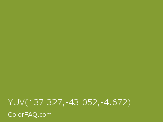 YUV 137.327,-43.052,-4.672 Color is a normal lime color and the nearest color is Sushi #87ab39. Hex code #849d32 and RGB value is rgb(132,157,50). In RGB color space, this color is composed of 52% red, 62% green, 20% blue, In CMYK color space, this color is composed of 16% cyan, 0% magenta, 68% yellow , 38% black , In HSL color space, this color has a hue angle of 74° , 52% saturation and 41% lightness.
