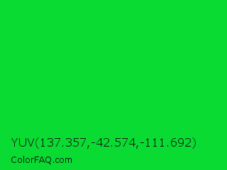YUV 137.357,-42.574,-111.692 Color is a normal green color and the nearest color is Vivid Malachite #00cc33. Hex code #0adb33 and RGB value is rgb(10,219,51). In RGB color space, this color is composed of 4% red, 86% green, 20% blue, In CMYK color space, this color is composed of 95% cyan, 0% magenta, 77% yellow , 14% black , In HSL color space, this color has a hue angle of 132° , 91% saturation and 45% lightness.