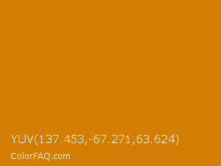 YUV 137.453,-67.271,63.624 Color is a normal orange color and the nearest color is Meteor #d07d12. Hex code #d27f01 and RGB value is rgb(210,127,1). In RGB color space, this color is composed of 82% red, 50% green, 0% blue, In CMYK color space, this color is composed of 0% cyan, 40% magenta, 100% yellow , 18% black , In HSL color space, this color has a hue angle of 36° , 99% saturation and 41% lightness.