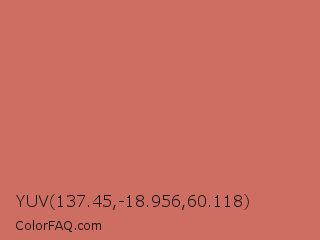 YUV 137.45,-18.956,60.118 Color is a normal red color and the nearest color is Fuzzy Wuzzy #cc6666. Hex code #ce6e63 and RGB value is rgb(206,110,99). In RGB color space, this color is composed of 81% red, 43% green, 39% blue, In CMYK color space, this color is composed of 0% cyan, 47% magenta, 52% yellow , 19% black , In HSL color space, this color has a hue angle of 6° , 52% saturation and 60% lightness.