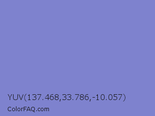 YUV 137.468,33.786,-10.057 Color is a light blue color and the nearest color is Moody Blue #7f76d3. Hex code #7e82ce and RGB value is rgb(126,130,206). In RGB color space, this color is composed of 49% red, 51% green, 81% blue, In CMYK color space, this color is composed of 39% cyan, 37% magenta, 0% yellow , 19% black , In HSL color space, this color has a hue angle of 237° , 45% saturation and 65% lightness.