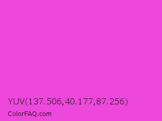 YUV 137.506,40.177,87.256 Color is a normal magenta color and the nearest color is Purple Pizzazz #fe4eda. Hex code #ed47db and RGB value is rgb(237,71,219). In RGB color space, this color is composed of 93% red, 28% green, 86% blue, In CMYK color space, this color is composed of 0% cyan, 70% magenta, 8% yellow , 7% black , In HSL color space, this color has a hue angle of 307° , 82% saturation and 60% lightness.