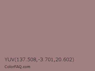 YUV 137.508,-3.701,20.602 Color is a normal red color and the nearest color is Pharlap #a3807b. Hex code #a17f82 and RGB value is rgb(161,127,130). In RGB color space, this color is composed of 63% red, 50% green, 51% blue, In CMYK color space, this color is composed of 0% cyan, 21% magenta, 19% yellow , 37% black , In HSL color space, this color has a hue angle of 355° , 15% saturation and 56% lightness.
