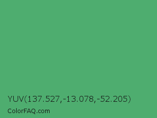 YUV 137.527,-13.078,-52.205 Color is a normal green color and the nearest color is Ocean Green #41aa78. Hex code #4ead6f and RGB value is rgb(78,173,111). In RGB color space, this color is composed of 31% red, 68% green, 44% blue, In CMYK color space, this color is composed of 55% cyan, 0% magenta, 36% yellow , 32% black , In HSL color space, this color has a hue angle of 141° , 38% saturation and 49% lightness.