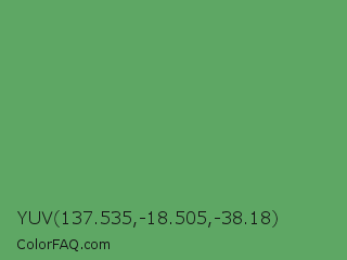 YUV 137.535,-18.505,-38.18 Color is a normal green color and the nearest color is Fern #63b76c. Hex code #5ea764 and RGB value is rgb(94,167,100). In RGB color space, this color is composed of 37% red, 65% green, 39% blue, In CMYK color space, this color is composed of 44% cyan, 0% magenta, 40% yellow , 35% black , In HSL color space, this color has a hue angle of 125° , 29% saturation and 51% lightness.