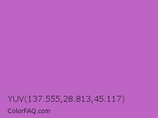 YUV 137.555,28.813,45.117 Color is a normal magenta color and the nearest color is Rich Lilac #b666d2. Hex code #bd64c4 and RGB value is rgb(189,100,196). In RGB color space, this color is composed of 74% red, 39% green, 77% blue, In CMYK color space, this color is composed of 4% cyan, 49% magenta, 0% yellow , 23% black , In HSL color space, this color has a hue angle of 296° , 45% saturation and 58% lightness.