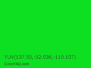 YUV 137.55,-52.036,-110.107 Color is a normal green color and the nearest color is Vivid Malachite #00cc33. Hex code #0cde20 and RGB value is rgb(12,222,32). In RGB color space, this color is composed of 5% red, 87% green, 13% blue, In CMYK color space, this color is composed of 95% cyan, 0% magenta, 86% yellow , 13% black , In HSL color space, this color has a hue angle of 126° , 90% saturation and 46% lightness.