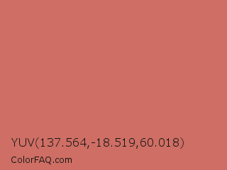 YUV 137.564,-18.519,60.018 Color is a normal red color and the nearest color is Fuzzy Wuzzy #cc6666. Hex code #ce6e64 and RGB value is rgb(206,110,100). In RGB color space, this color is composed of 81% red, 43% green, 39% blue, In CMYK color space, this color is composed of 0% cyan, 47% magenta, 51% yellow , 19% black , In HSL color space, this color has a hue angle of 6° , 52% saturation and 60% lightness.