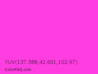 YUV 137.588,42.601,102.97 Color is a light magenta color and the nearest color is Purple Pizzazz #fe4eda. Hex code #ff3de0 and RGB value is rgb(255,61,224). In RGB color space, this color is composed of 100% red, 24% green, 88% blue, In CMYK color space, this color is composed of 0% cyan, 76% magenta, 12% yellow , 0% black , In HSL color space, this color has a hue angle of 310° , 100% saturation and 62% lightness.