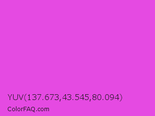 YUV 137.673,43.545,80.094 Color is a normal magenta color and the nearest color is Purple Pizzazz #fe4eda. Hex code #e54ae2 and RGB value is rgb(229,74,226). In RGB color space, this color is composed of 90% red, 29% green, 89% blue, In CMYK color space, this color is composed of 0% cyan, 68% magenta, 1% yellow , 10% black , In HSL color space, this color has a hue angle of 301° , 75% saturation and 59% lightness.