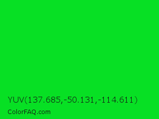 YUV 137.685,-50.131,-114.611 Color is a normal green color and the nearest color is Vivid Malachite #00cc33. Hex code #07e024 and RGB value is rgb(7,224,36). In RGB color space, this color is composed of 3% red, 88% green, 14% blue, In CMYK color space, this color is composed of 97% cyan, 0% magenta, 84% yellow , 12% black , In HSL color space, this color has a hue angle of 128° , 94% saturation and 45% lightness.
