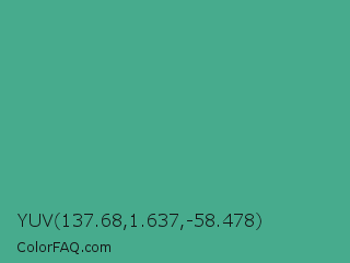 YUV 137.68,1.637,-58.478 Color is a normal green color and the nearest color is Mint #3eb489. Hex code #47ab8d and RGB value is rgb(71,171,141). In RGB color space, this color is composed of 28% red, 67% green, 55% blue, In CMYK color space, this color is composed of 58% cyan, 0% magenta, 18% yellow , 33% black , In HSL color space, this color has a hue angle of 162° , 41% saturation and 47% lightness.