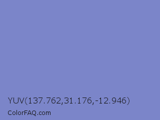 YUV 137.762,31.176,-12.946 Color is a light blue color and the nearest color is Ship Cove #788bba. Hex code #7b85c9 and RGB value is rgb(123,133,201). In RGB color space, this color is composed of 48% red, 52% green, 79% blue, In CMYK color space, this color is composed of 39% cyan, 34% magenta, 0% yellow , 21% black , In HSL color space, this color has a hue angle of 232° , 42% saturation and 64% lightness.