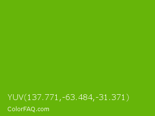 YUV 137.771,-63.484,-31.371 Color is a normal green color and the nearest color is Christi #67a712. Hex code #66b509 and RGB value is rgb(102,181,9). In RGB color space, this color is composed of 40% red, 71% green, 4% blue, In CMYK color space, this color is composed of 44% cyan, 0% magenta, 95% yellow , 29% black , In HSL color space, this color has a hue angle of 88° , 91% saturation and 37% lightness.