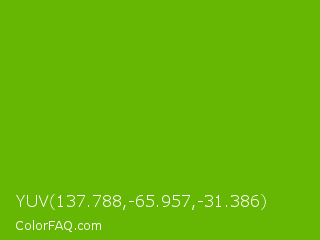 YUV 137.788,-65.957,-31.386 Color is a normal green color and the nearest color is Christi #67a712. Hex code #66b604 and RGB value is rgb(102,182,4). In RGB color space, this color is composed of 40% red, 71% green, 2% blue, In CMYK color space, this color is composed of 44% cyan, 0% magenta, 98% yellow , 29% black , In HSL color space, this color has a hue angle of 87° , 96% saturation and 36% lightness.