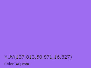 YUV 137.813,50.871,16.827 Color is a light violet color and the nearest color is Navy Purple #9457eb. Hex code #9d6cf1 and RGB value is rgb(157,108,241). In RGB color space, this color is composed of 62% red, 42% green, 95% blue, In CMYK color space, this color is composed of 35% cyan, 55% magenta, 0% yellow , 5% black , In HSL color space, this color has a hue angle of 262° , 83% saturation and 68% lightness.