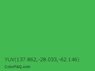 YUV 137.862,-28.033,-62.146 Color is a normal green color and the nearest color is Chateau Green #40a860. Hex code #43b951 and RGB value is rgb(67,185,81). In RGB color space, this color is composed of 26% red, 73% green, 32% blue, In CMYK color space, this color is composed of 64% cyan, 0% magenta, 56% yellow , 27% black , In HSL color space, this color has a hue angle of 127° , 47% saturation and 49% lightness.