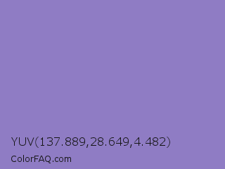 YUV 137.889,28.649,4.482 Color is a light indigo color and the nearest color is Ube #8878c3. Hex code #8f7cc4 and RGB value is rgb(143,124,196). In RGB color space, this color is composed of 56% red, 49% green, 77% blue, In CMYK color space, this color is composed of 27% cyan, 37% magenta, 0% yellow , 23% black , In HSL color space, this color has a hue angle of 256° , 38% saturation and 63% lightness.