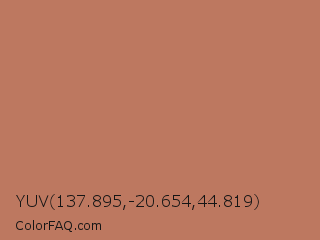 YUV 137.895,-20.654,44.819 Color is a normal color and the nearest color is Contessa #c6726b. Hex code #bd7860 and RGB value is rgb(189,120,96). In RGB color space, this color is composed of 74% red, 47% green, 38% blue, In CMYK color space, this color is composed of 0% cyan, 37% magenta, 49% yellow , 26% black , In HSL color space, this color has a hue angle of 15° , 41% saturation and 56% lightness.