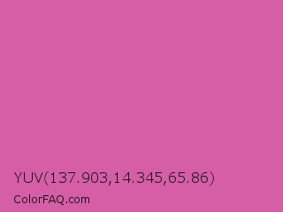 YUV 137.903,14.345,65.86 Color is a normal magenta color and the nearest color is Super Pink #cf6ba9. Hex code #d55ea7 and RGB value is rgb(213,94,167). In RGB color space, this color is composed of 84% red, 37% green, 65% blue, In CMYK color space, this color is composed of 0% cyan, 56% magenta, 22% yellow , 16% black , In HSL color space, this color has a hue angle of 323° , 59% saturation and 60% lightness.
