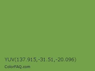YUV 137.915,-31.51,-20.096 Color is a normal green color and the nearest color is Palm Leaf #6f9940. Hex code #73a24a and RGB value is rgb(115,162,74). In RGB color space, this color is composed of 45% red, 64% green, 29% blue, In CMYK color space, this color is composed of 29% cyan, 0% magenta, 54% yellow , 36% black , In HSL color space, this color has a hue angle of 92° , 37% saturation and 46% lightness.