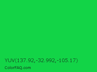 YUV 137.92,-32.992,-105.17 Color is a normal green color and the nearest color is Malachite #0bda51. Hex code #12d447 and RGB value is rgb(18,212,71). In RGB color space, this color is composed of 7% red, 83% green, 28% blue, In CMYK color space, this color is composed of 92% cyan, 0% magenta, 67% yellow , 17% black , In HSL color space, this color has a hue angle of 136° , 84% saturation and 45% lightness.